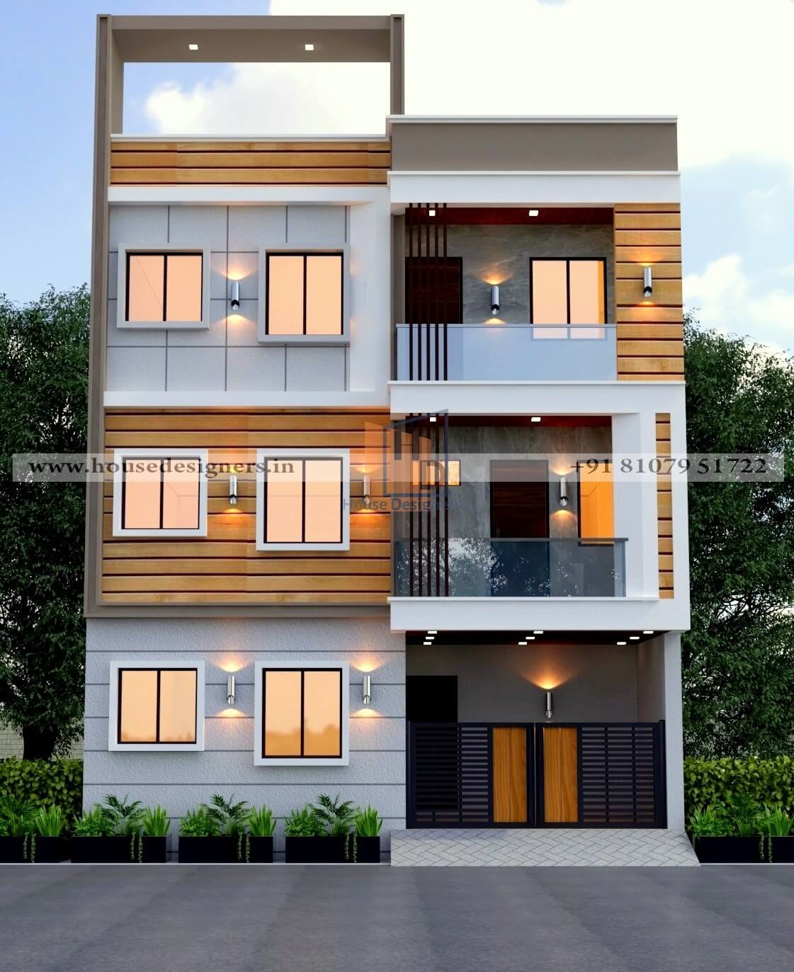 30×60 ft, get front elevation designed, white, grey and brown color theme, wooden tiles, grooves, MS pipe in front of the balcony.